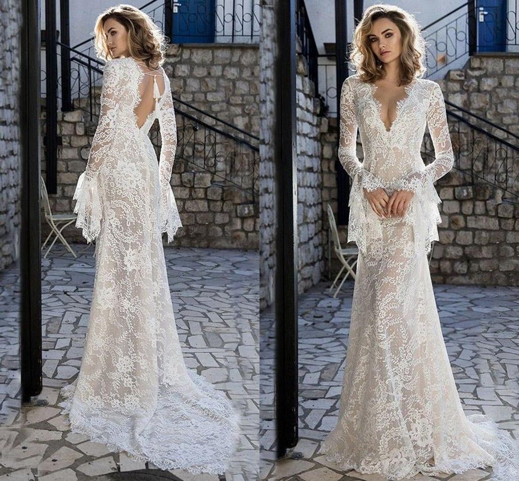 Long Sleeve Lace Wedding Dress V Neck Boho Wedding Dresses Beach