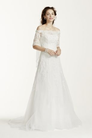 We adore the scalloped detail on the off the shoulder neckline leading to delicate long sleeves. Find off the shoulder wedding dresses in lace more in all sizes at davids bridal today. Lace and tulle create a fit and flare silhouette with a modern neckline that shows off the brides shoulders and focuses on the off the shoulder sleeves.